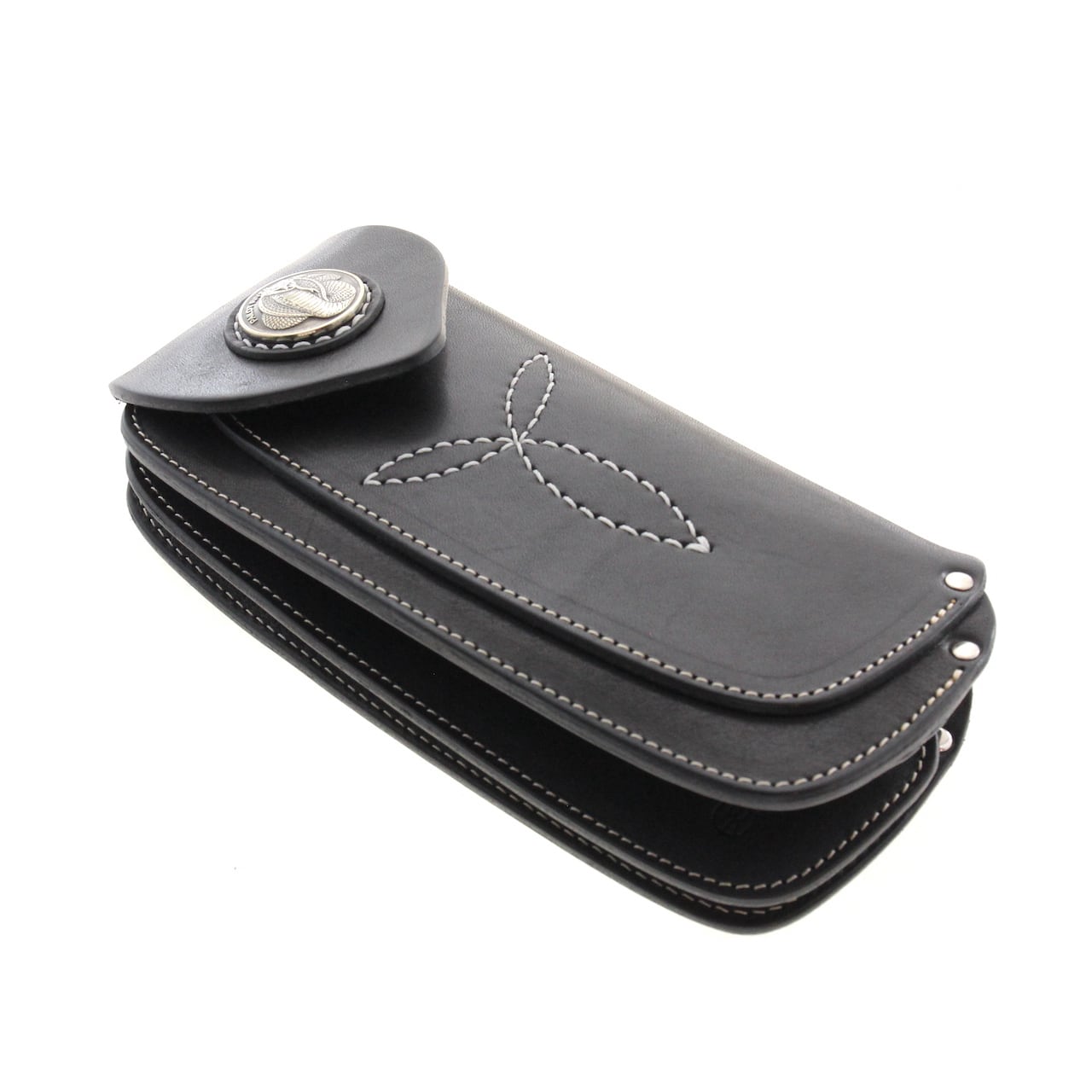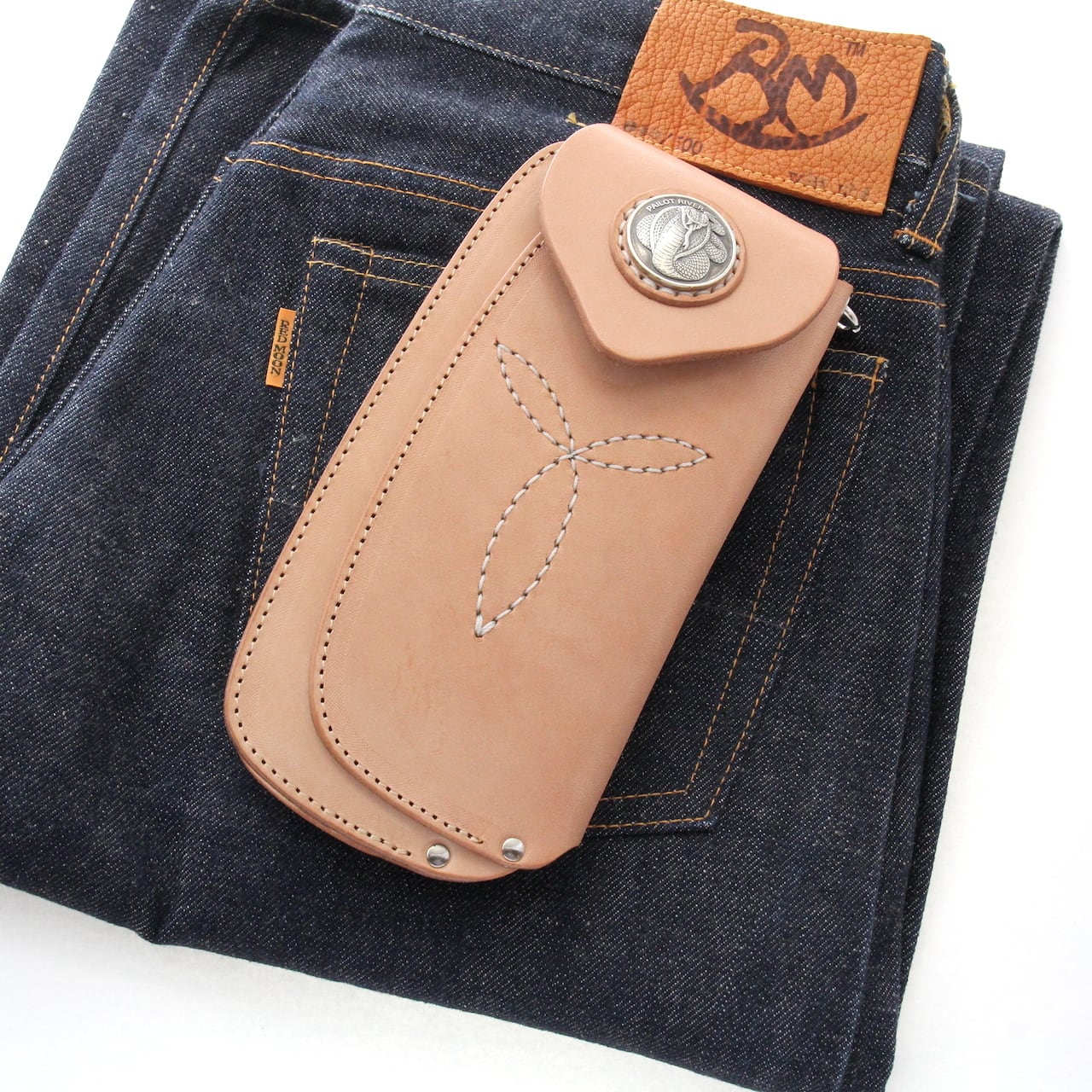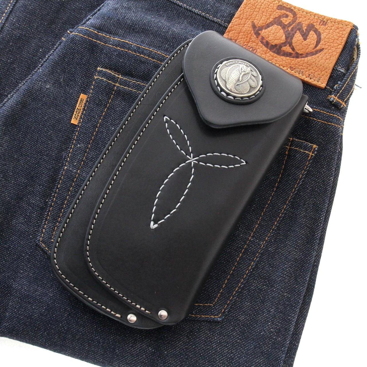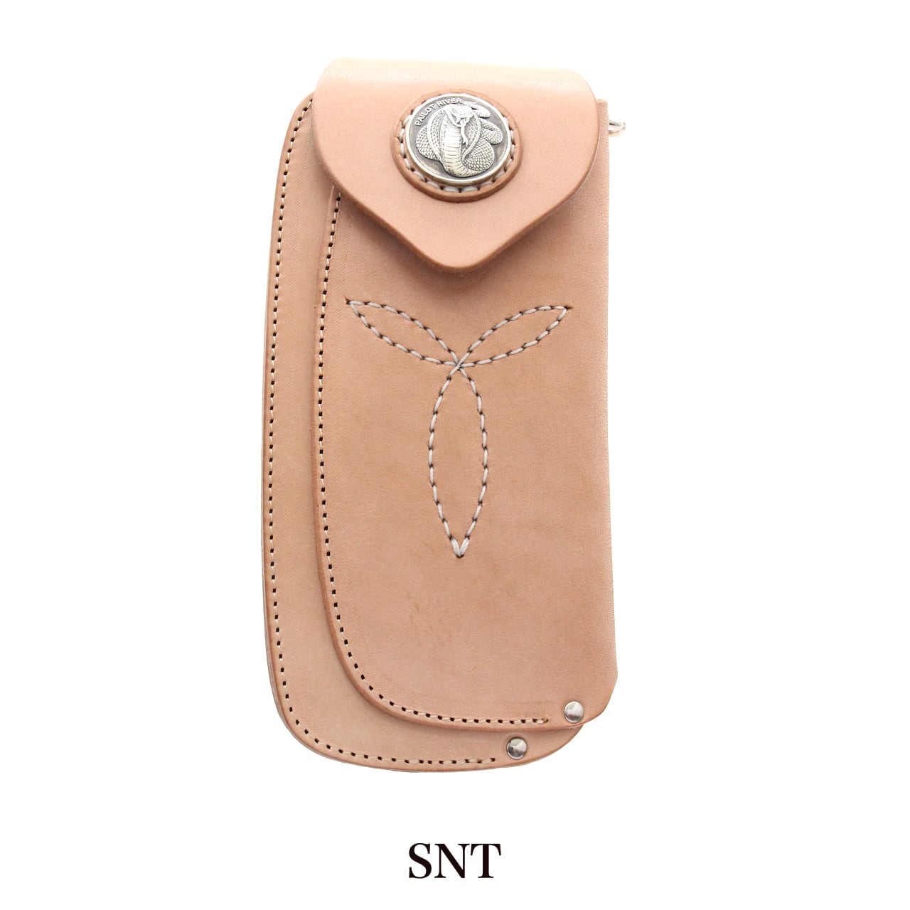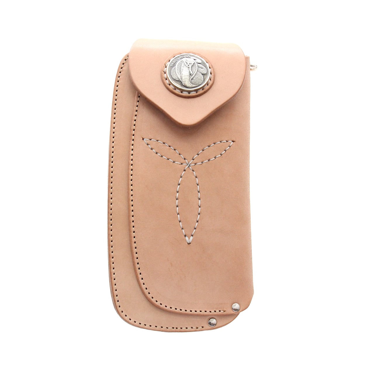 オリジナルサドルレザーを使用した本体フラップ部にはPAILOT RIVERオリジナルデザインコンチョの「キングコブラ」が装飾されています。