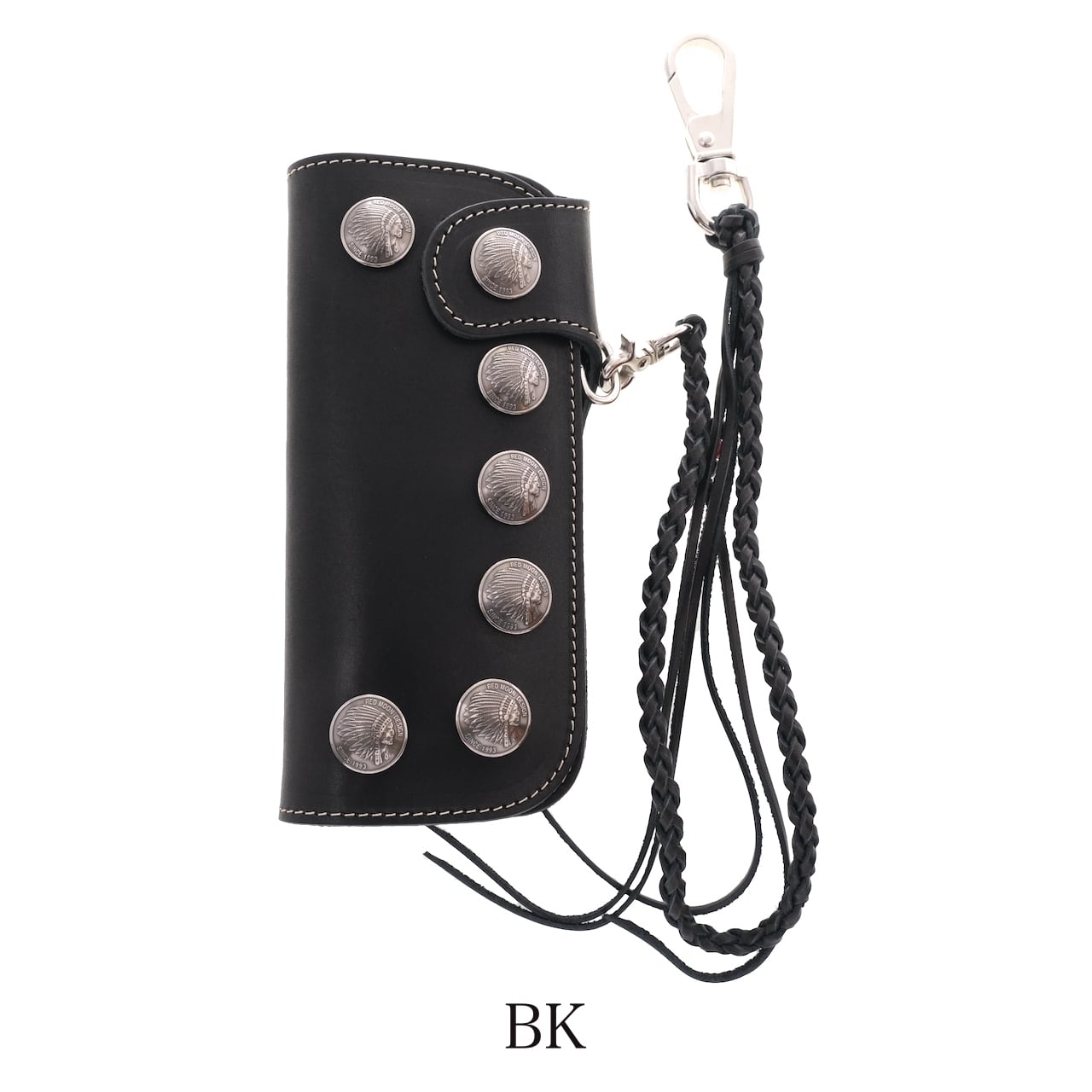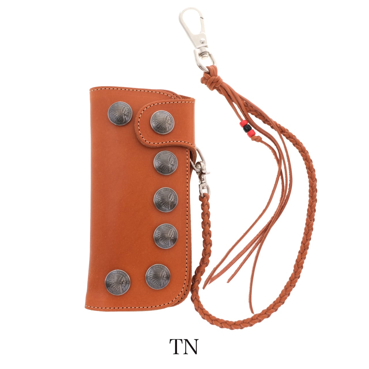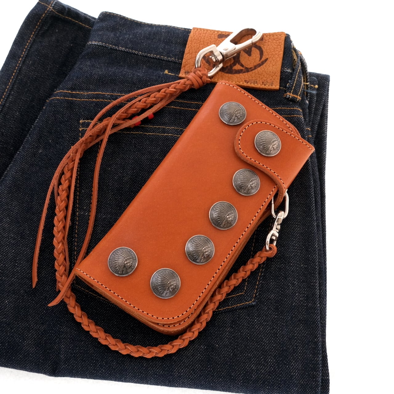 4本編みのレザーロープが付いたバイカーズウォレットモデル。