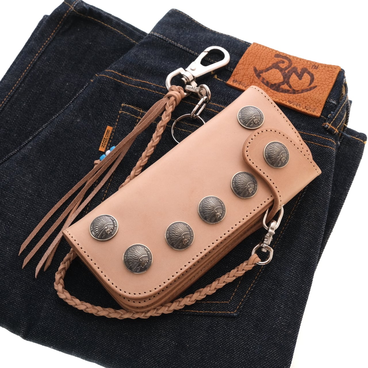 4本編みのレザーロープが付いたバイカーズウォレットモデル。