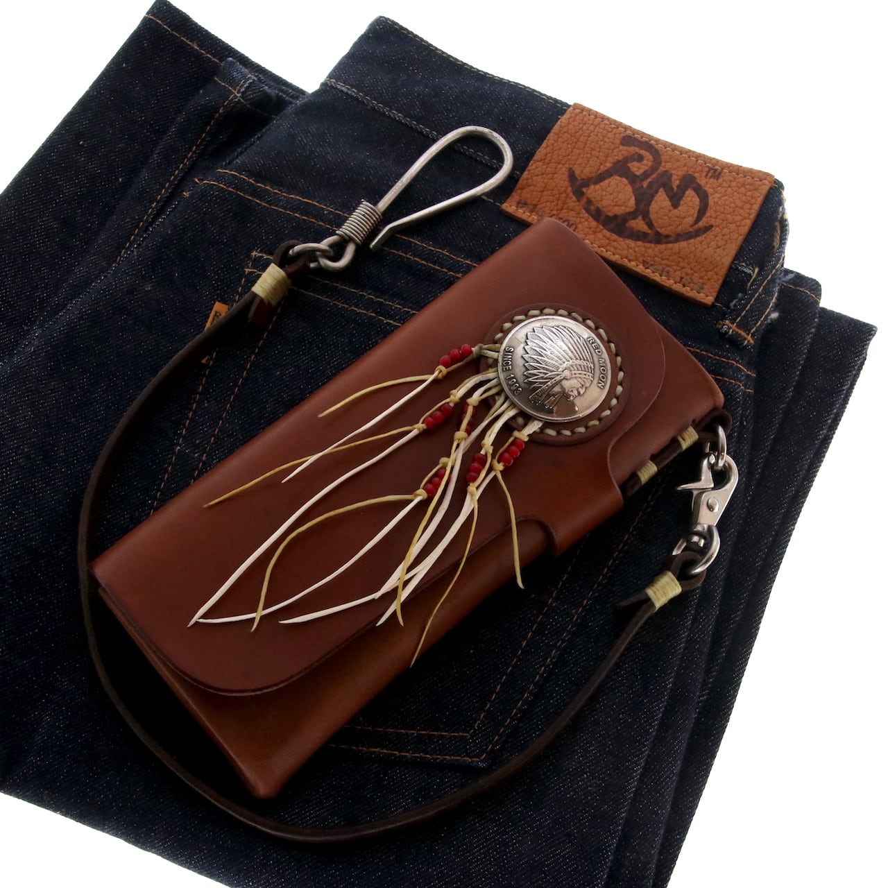 REDMOONオリジナルデザインフックが付いたウォレットロープが付属します。