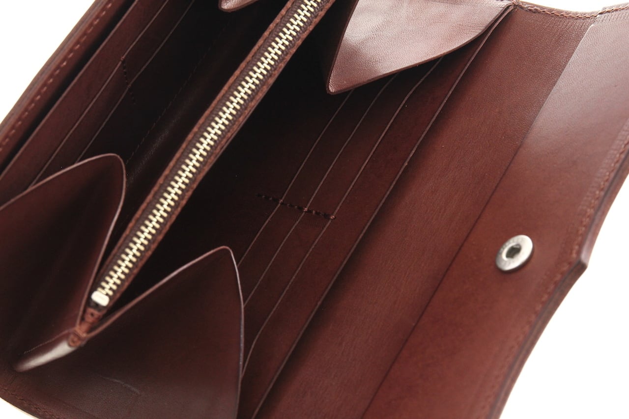 長年培ってきたノウハウと技術を活かし、上質な素材と丁寧な職人の手仕事によって作り上げられたこのウォレットは、上品さと耐久性を兼ね備えています。