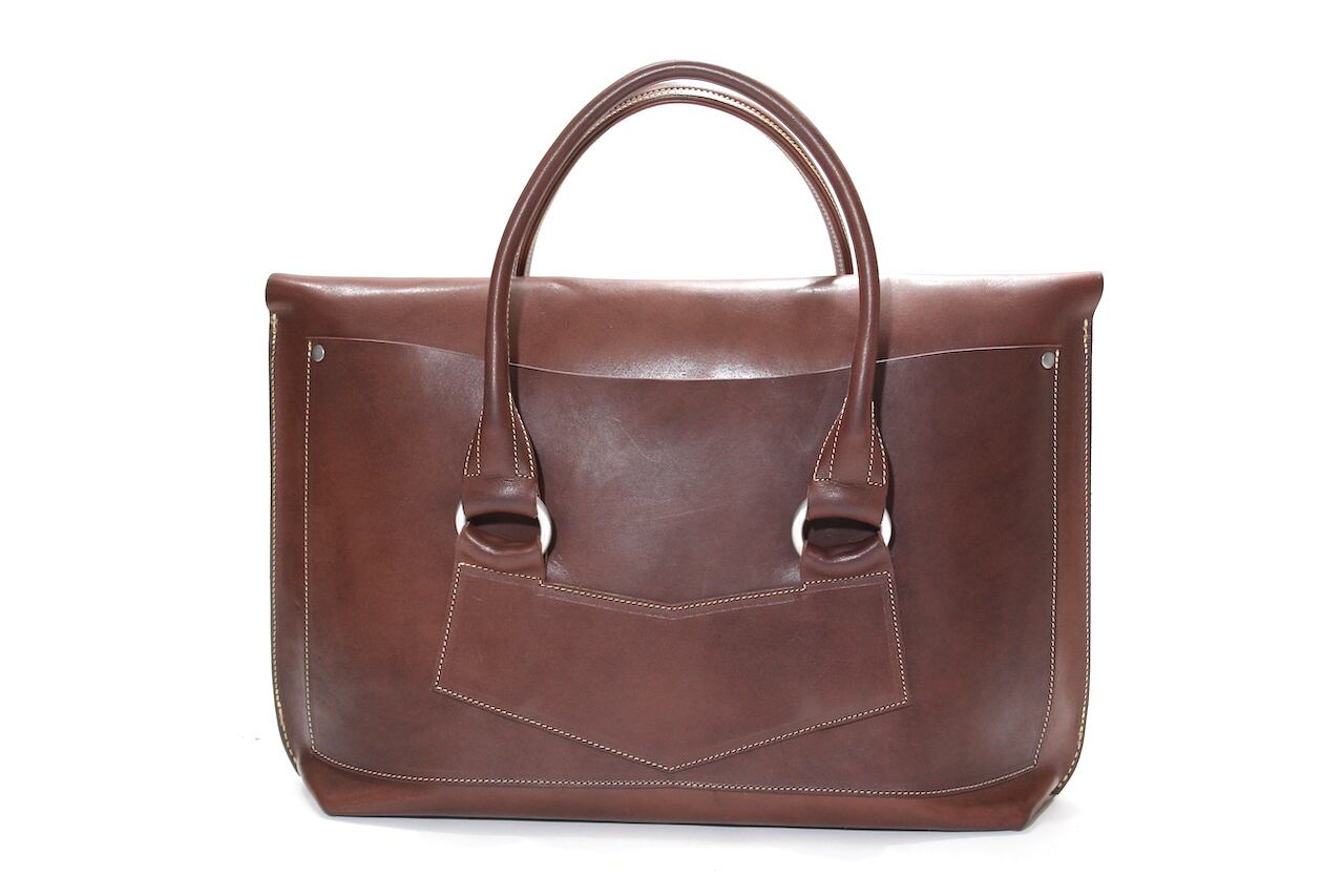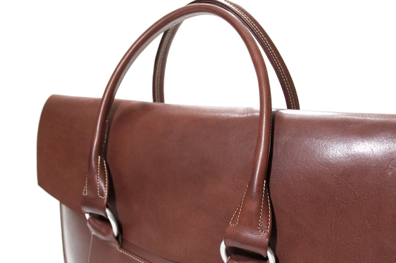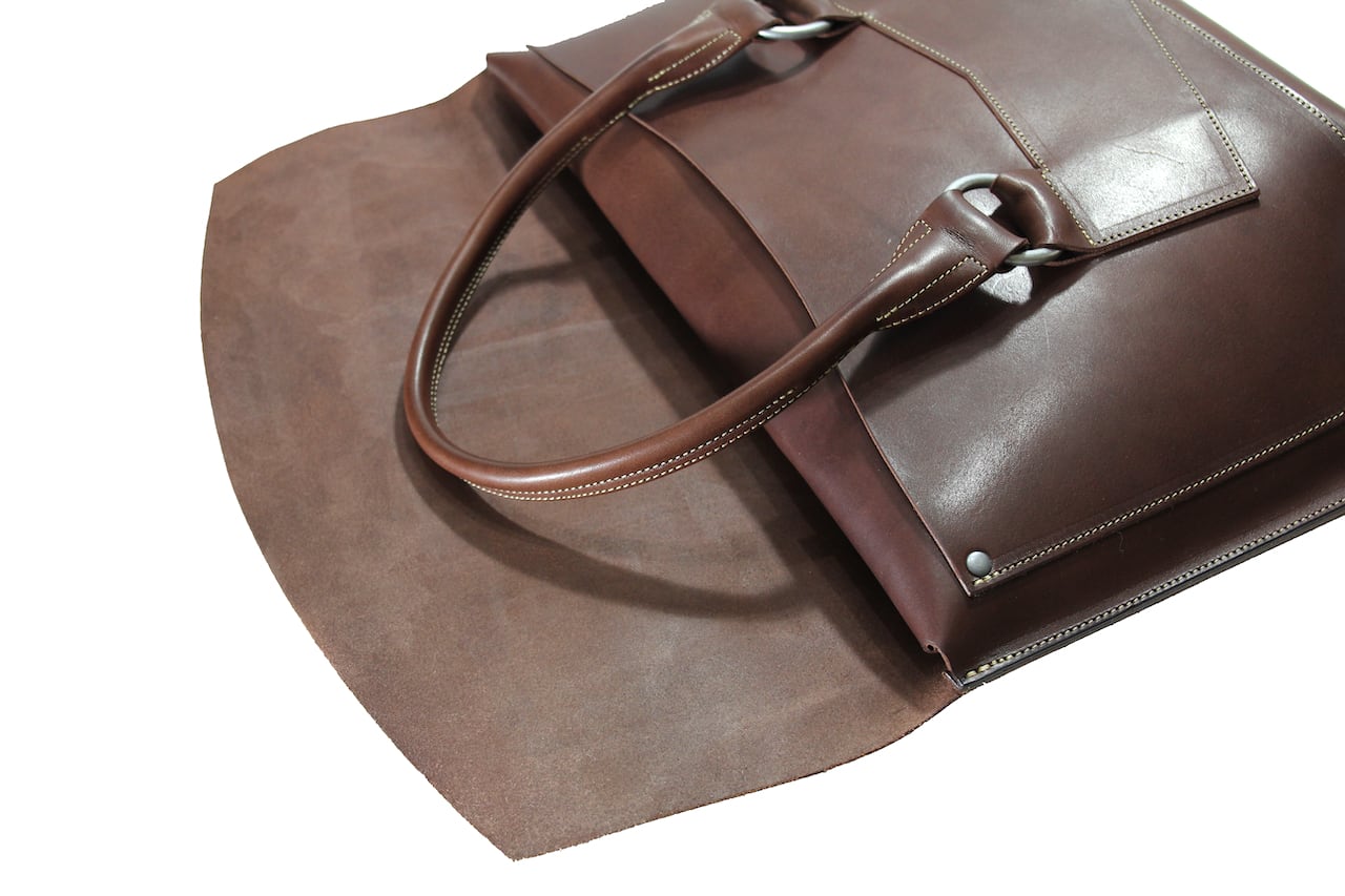 本体は贅沢に1枚革を使ったデザインで、両側をインナーに折り畳んだフラップ仕様です。
