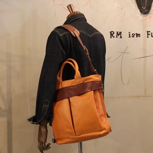 大ぶりなフロントのダブルポケットには堅牢なサドルレザー製のカバーでアクセントをもたせています。